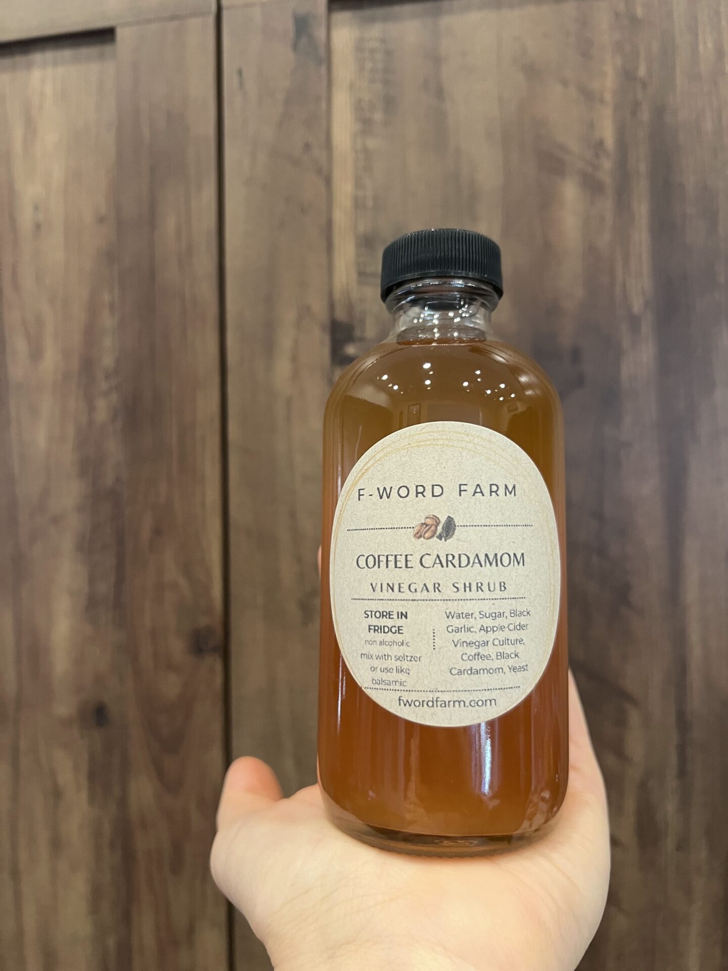 Shrubs are a combination of fruit, a sweetener and vinegar. This is made from spent coffee upcycled from Blisspoint Meadery’s Coffee mead and black cardamom (which is smoky and lightly bitter) syrup, mixed with F-Word Farm Black Gold Vinegar! Sweet and sour, coffee-y/cardamom-y. Mix with seltzer water for a sparkling coffee on ice or add a dash to an espresso martini to amp it up. Also good on roasted veg (especially carrots or beets) to finish. Excellent in caramelized onions.