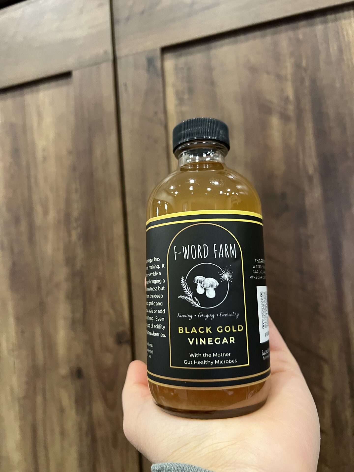 Sweet and sour, this vinegar was made in a style to mimic balsamic. It starts with F-Word Farm grown garlic that takes 9 months to grow and another few months to cure and turn into black garlic. Black garlic is a caramel-y/molasses-y rich flavor that is created by the caramelization of the sugar naturally present in garlic. Then it enters a nearly year long ferment, resulting in a vinegar with some residual sweetness and complexity from the black garlic. Great paired with soy sauce and any dishes that utilize it. Amazing in this caramelized onion recipe!